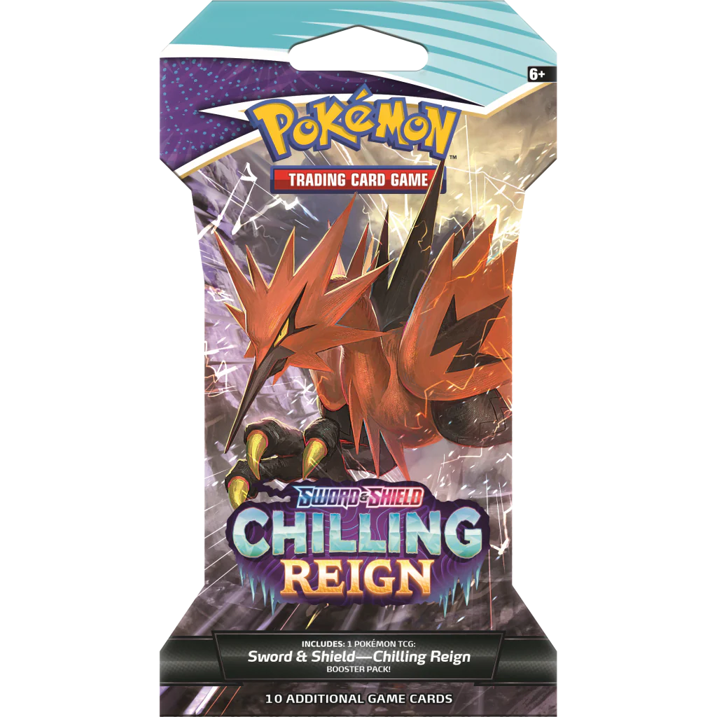 Seize the advantage with Pokémon of the frozen lands, with the powerful Ice Rider Calyrex VMAX and Shadow Rider Calyrex VMAX—plus the Galarian forms of Articuno, Zapdos, and Moltres! Phantom hauntings, howling blizzards, and wild battles—expand the realms of your Pokémon strategy with new powers and new possibilities. Press on despite ghostly opposition, and claim total victory in the land of spectral snow with the Pokémon TCG: Sword & Shield—Chilling Reign expansion!