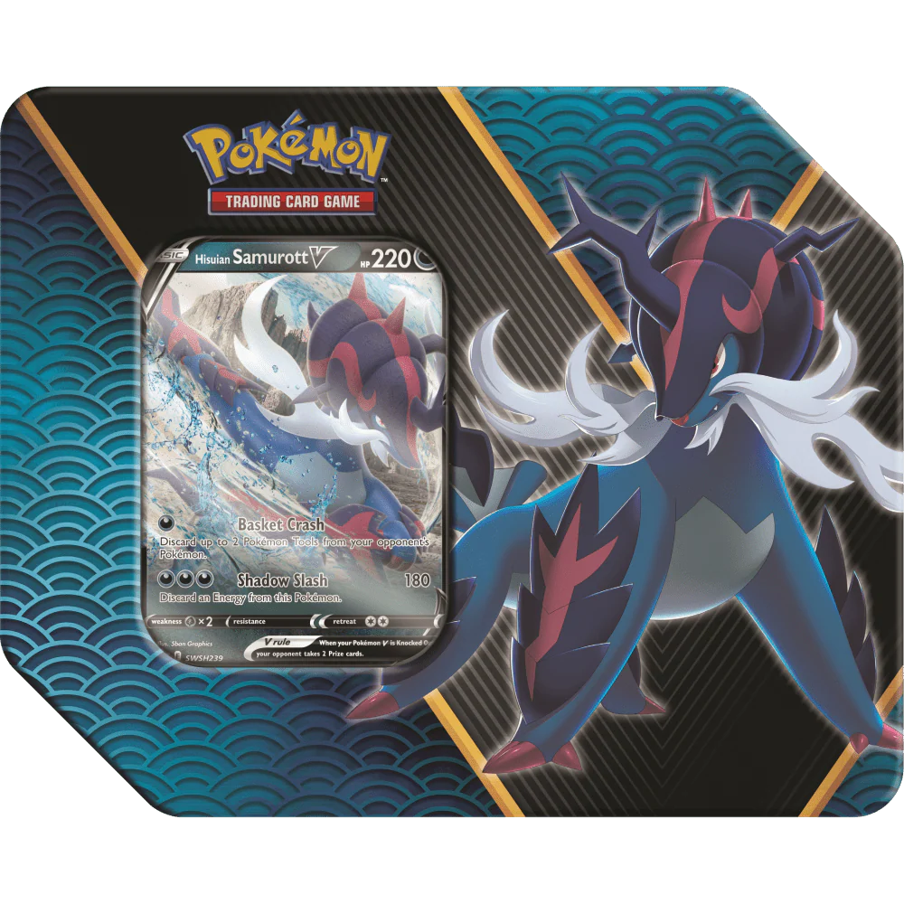 Hailing from the ancient region of Hisui, a trio of partner Pokémon with unique strengths are eager to join your deck! With this Divergent Powers Tin, you can choose the keen eye of Hisuian Decidueye V, the fearsome flames of Hisuian Typhlosion V, or the shadowy blades of Hisuian Samurott V, and then find even more useful Pokémon and Trainer cards in a handful of Pokémon TCG booster packs.